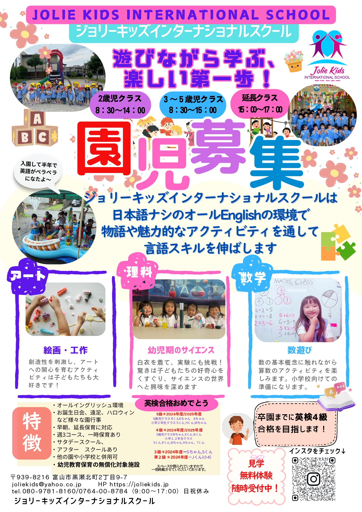 2歳から5歳児のための少人数制のプリスクール『ジョリーキッズ インターナショナルスクール』さん。ジョリーキッズでは通い始めて数ヶ月でも、英語で園生活を送っている子ども達がほとんどとのこと!これは、外国人の先生が常におられて、遊びながら英語を身つける『Play English 』を大切にしているジョリーキッズの特長のひとつです☆