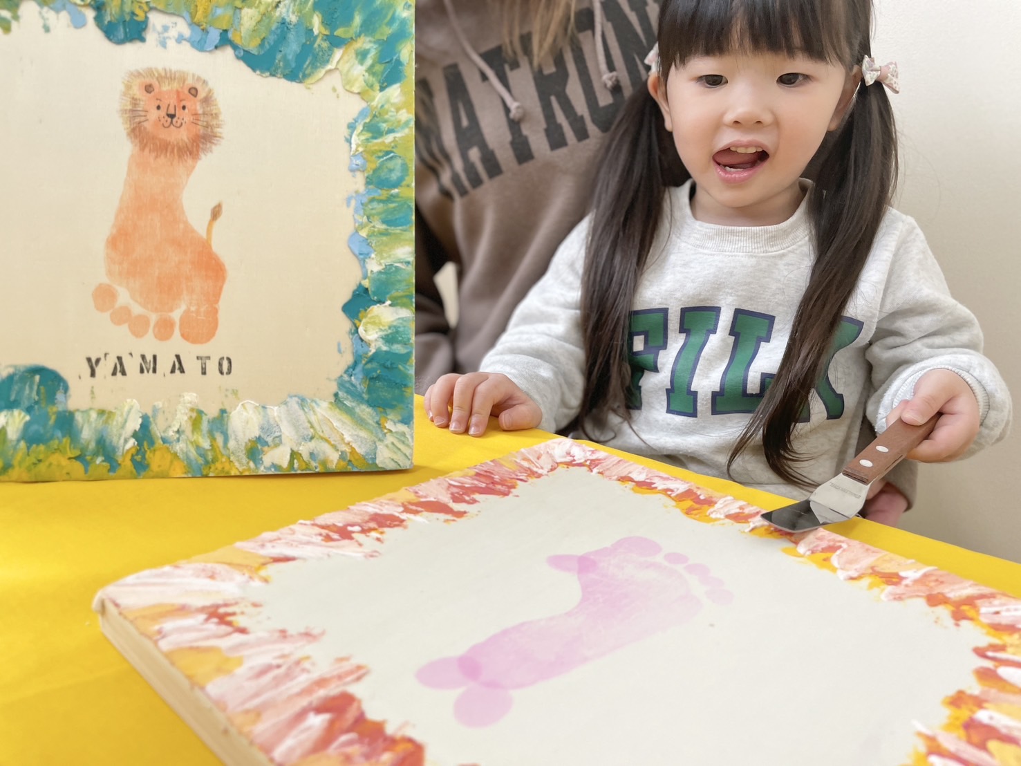 足形スタンプのカラーも複数種用意しているので、お子さんの好きな生き物や色を意識して作るのも楽しいですよ。他にも色鉛筆やアルファベットスタンプも用意するので、好みにデザインしてみてくださいね!