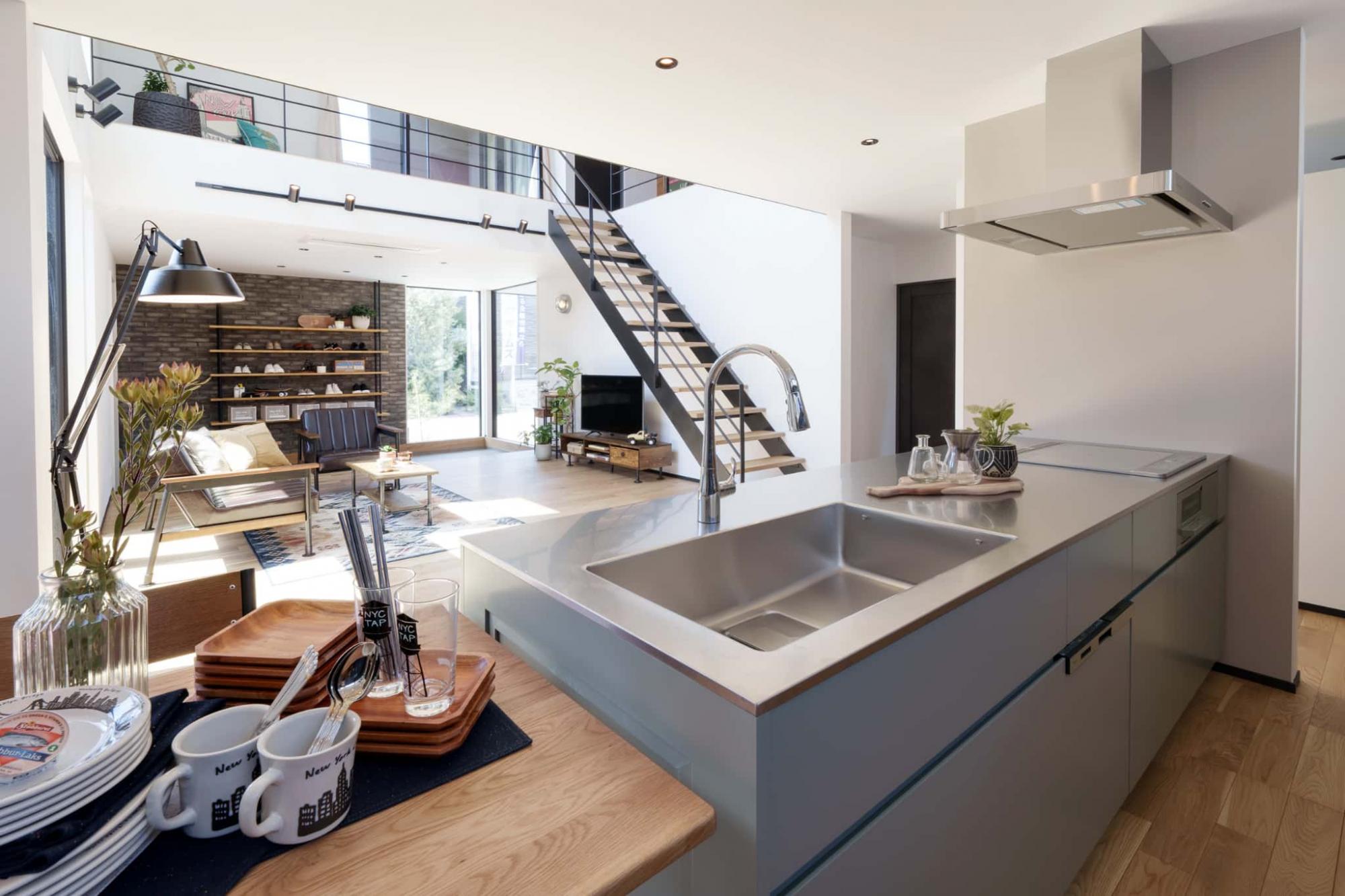 リビングからダイニングキッチンまで広がる吹抜けによってメリハリのある空間に。さらに、床材に用いたオークの木目とスチールとの異素材が、カッコよく印象的に演出しています。
