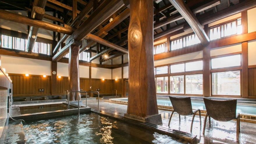 天井が高く開放感あふれる大浴じょうは、木の温もりに包まれた特別な造りです。昔ながらの和の趣とスケール感のある空間に、きっと心を動かされますよ♡