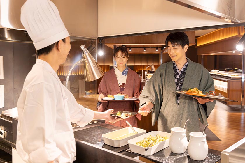 食事はバイキング形式で、和洋中さまざまなメニューがそろっています。ステーキや天ぷらなどのライブキッチンのほか、石川県の郷土料理「治部煮」など、ご当地グルメも楽しめます。離乳食や子ども用メニューが用意されており、好き嫌いが多いお子さんでも安心です。