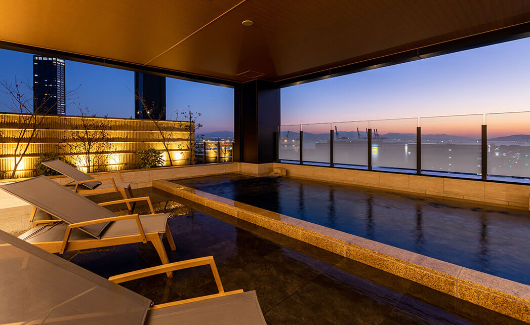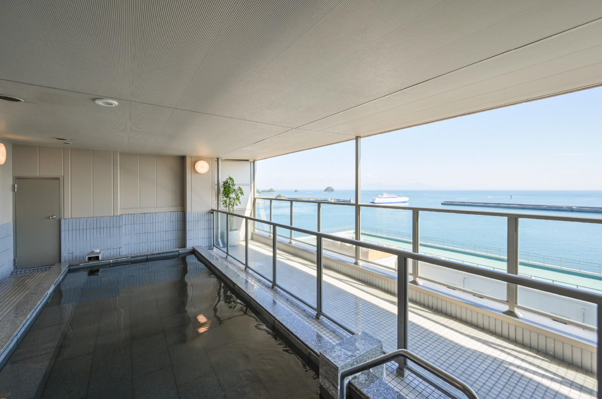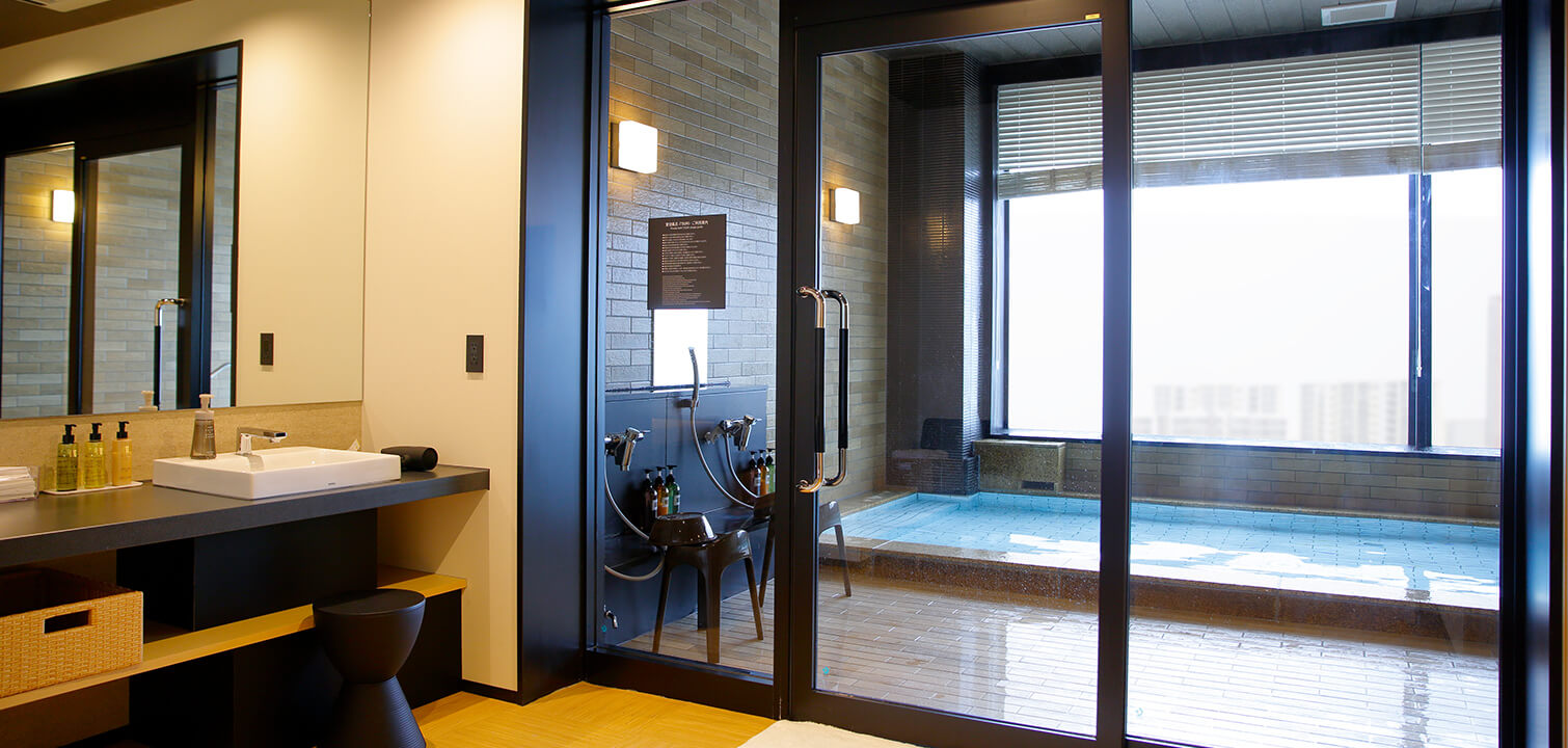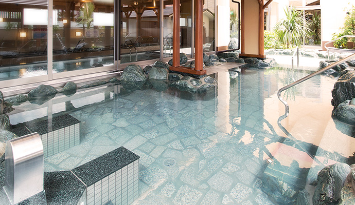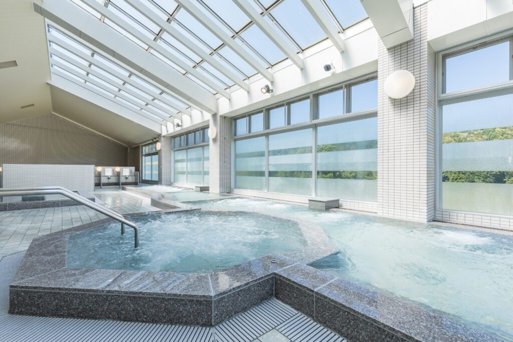 温泉はありませんが、宿泊者専用の温浴施設を完備。開放感たっぷりの大浴場は、入る時間帯によって違う雰囲気を楽しめます。