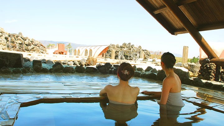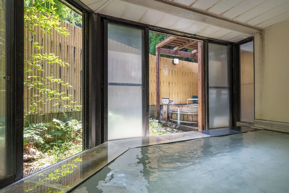 開放感あふれる大浴場に加えて、家族水入らずで利用できる貸切風呂「山霧」もおすすめです。女性限定の岩盤浴や岩盤サウナ、緑いっぱいの中にただずむ蒸し湯を楽しめますよ。