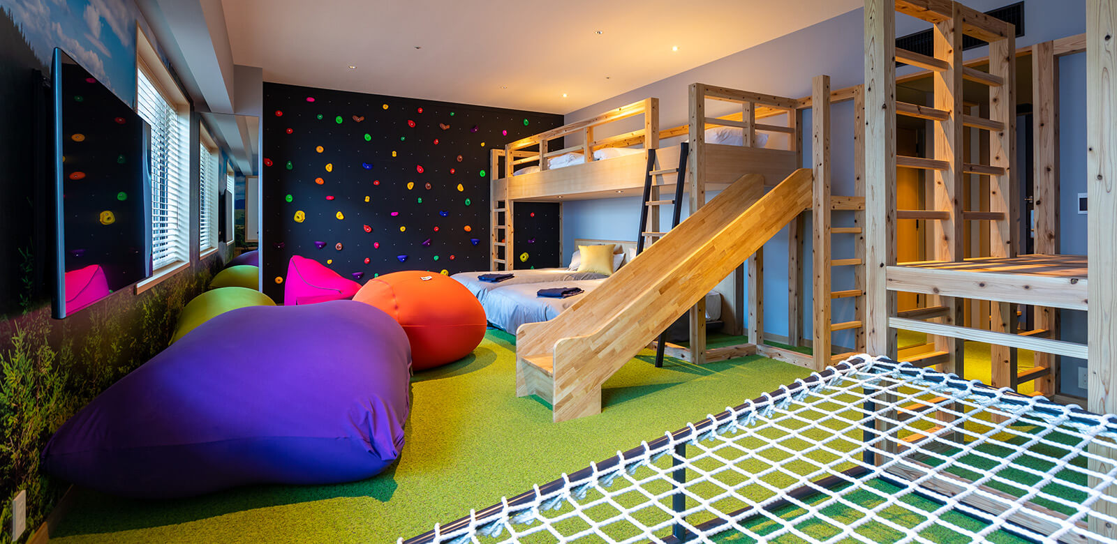 遊具付きの客室、プリンセス気分を楽しめる可愛らしいデザイン、乗り物好きのお子さんが夢中になるお部屋など、どれも個性豊か。