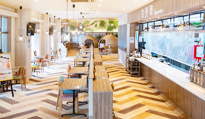 エリア最大級となる和洋中90種のビュッフェのほか、鹿児島黒牛や黒豚を味わえるレストランも人気の秘密。郷土の味覚を楽しめるのはもちろん、充実したデザートコーナーも用意されています。また、カフェテリアには子ども向けメニューが用意されており、親子で安心して利用できますよ。