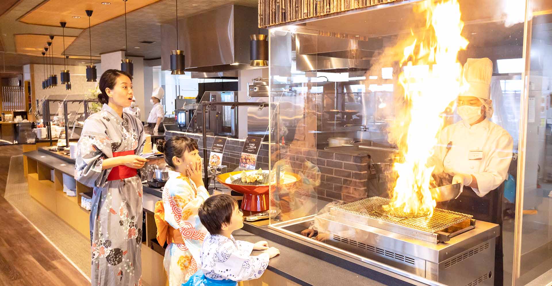 入浴後は、レストランで地元グルメや旬の食材を活かした多彩なメニューを味わえます。ライブキッチンでは、湯気の立つできたて料理に、子ども達は興味津々です。