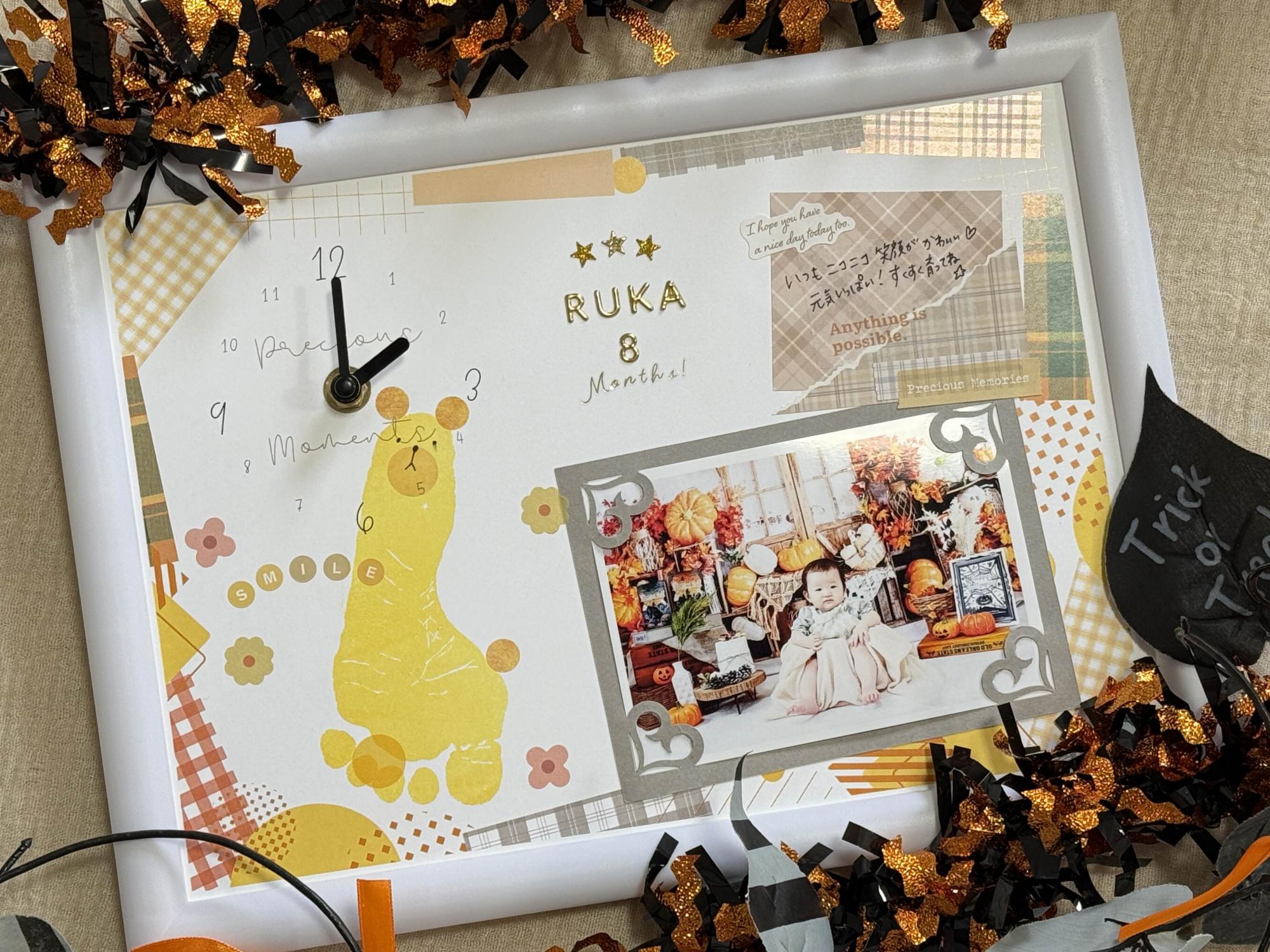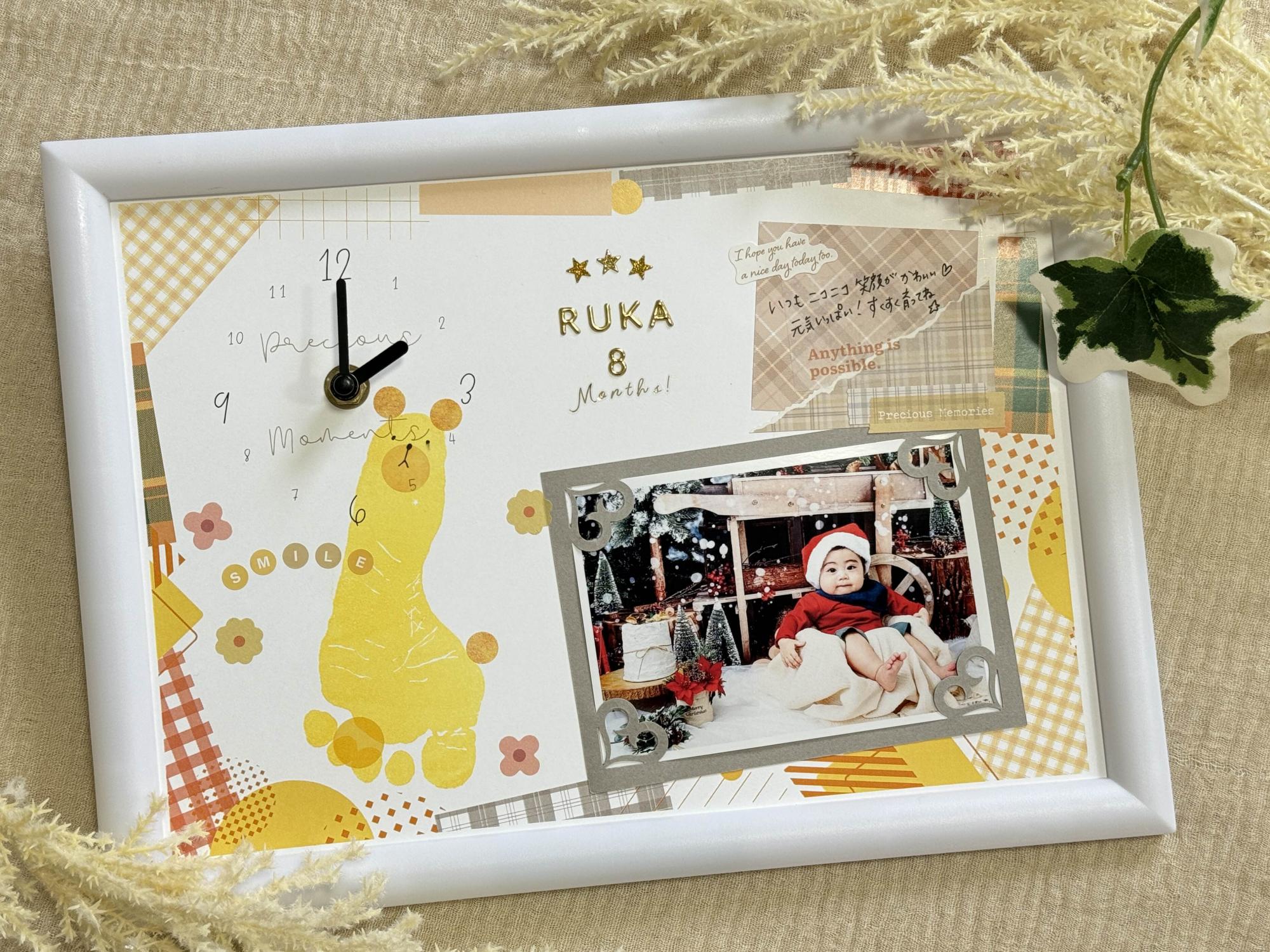 オリジナルデザインの時計台紙に写真を貼ったり、手形・足形を押印して、デコレーションすると特別な作品に仕上がりますよ。
