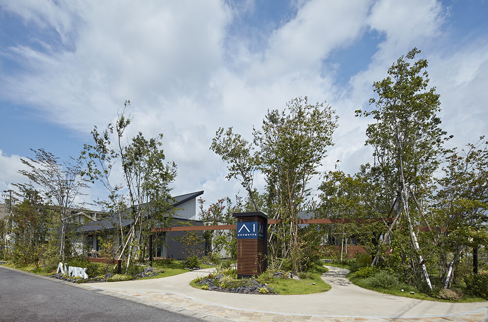 緑を多く取り込んだランドスケープの中に、縦空間の広がりを感じる1.3階建て平屋、深い軒で水平ラインを強調した寄棟屋根の2階建て、アイアンやモールなどで自分らしさを表現したナチュラルテイストの2階建てという、雰囲気の異なる3棟のモデルハウスが建ち並びます。