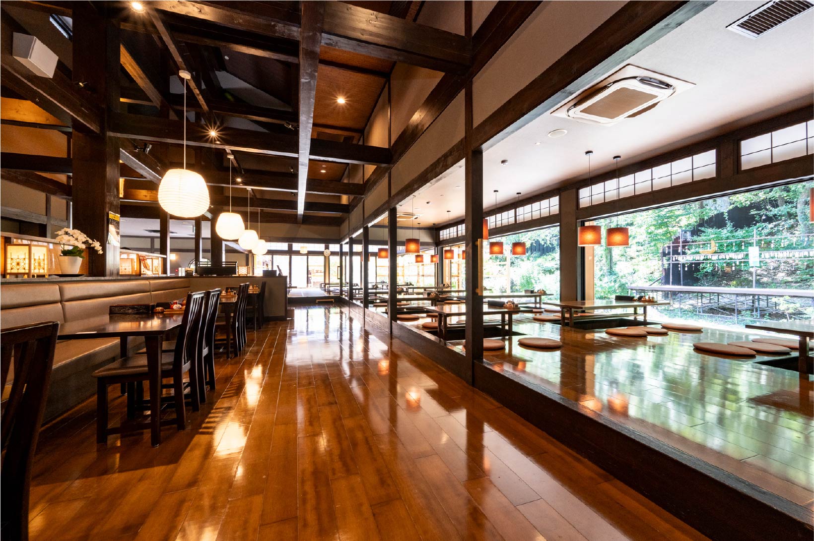 お食事処は、広々としていて、ゆっくりとくつろげる空間です。地元の名物「堅豆腐料理」をはじめ、郷土料理を楽しめます。使用しているお米は、地元産の飛騨コシヒカリ。さらに水は霊峰白山を水源とする、白山山系の地下水を汲み上げた井戸水で調理しています。