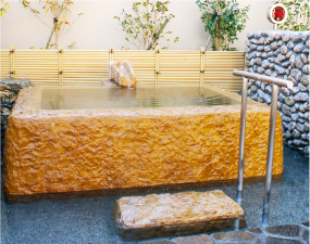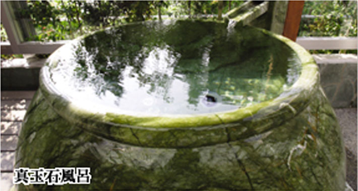 とくに注目したいお風呂は、露天風呂のひとつである新玉石風呂。古来より勾玉や神器に使用されている、中国の魔除けの石「真玉石」の原石をくりぬいて作られた石風呂です。