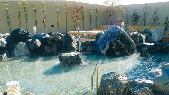 お風呂のお湯は、地下1,800mから湧出している天然温泉を使用しています。複数の露天風呂・内湯に加え、日本最大級の種類豊かな岩盤浴施設を併設。露天風呂は、全部で8種類もあるんですよ!