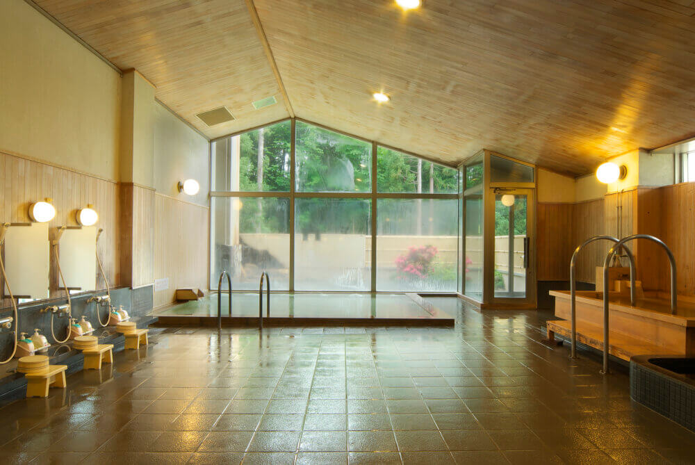 低張性で肌あたりの柔らかい「美人の湯」として知られています。モザイクタイルの洋風浴室や檜風呂・薬草風呂・暖炉付きのラウンジなど、癒しを重視した設備が揃った温泉です。