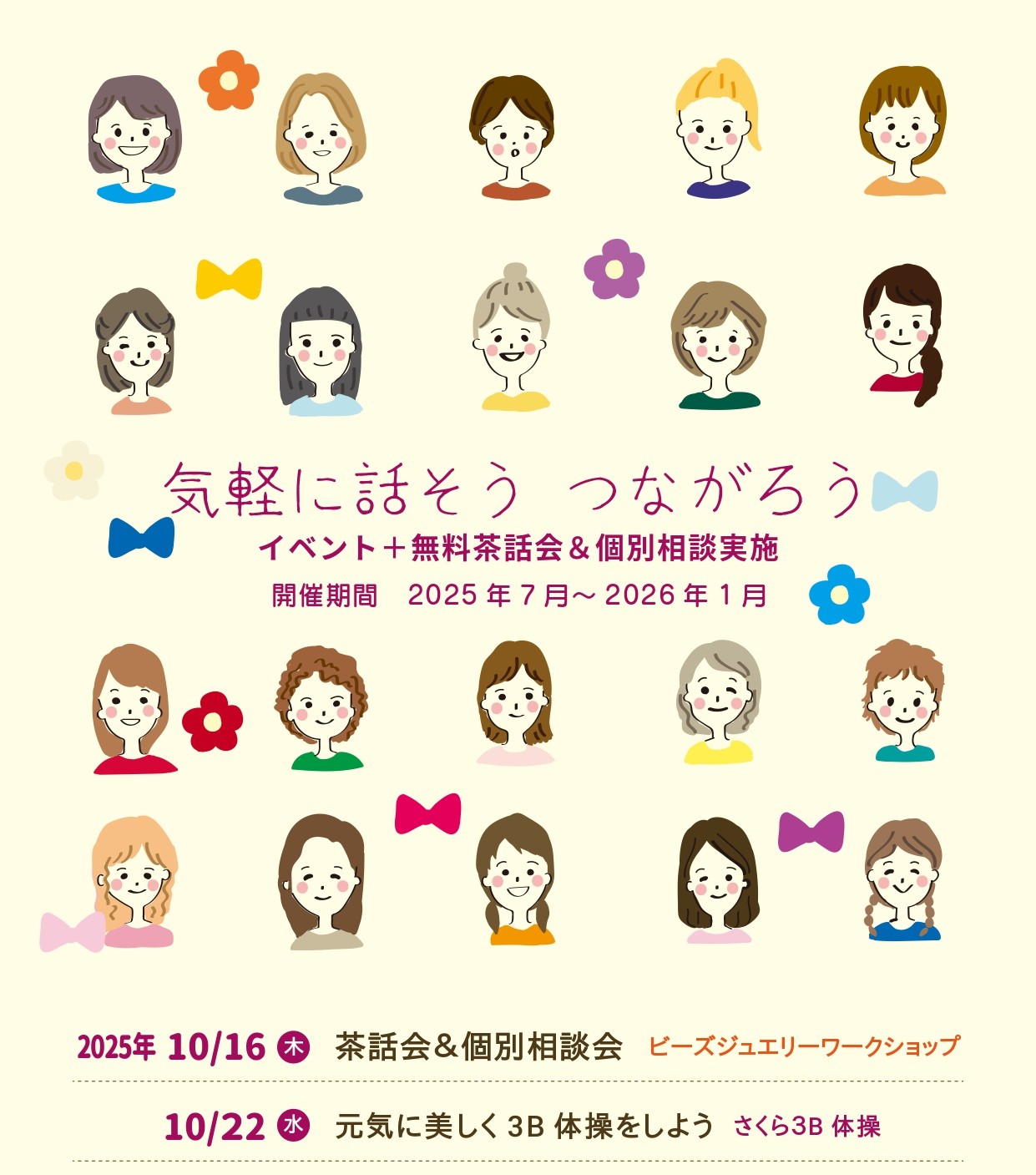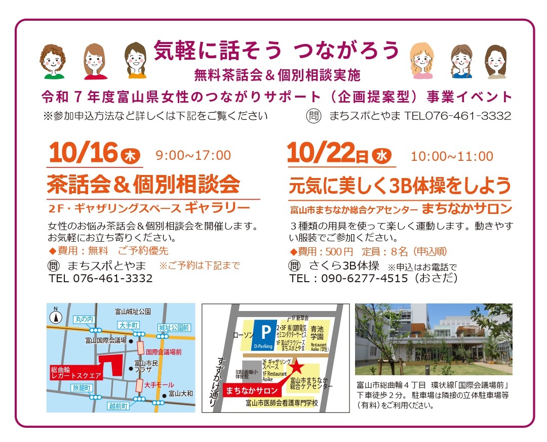 富山県女性のつながりサポート(企画提案型)事業として、2025年7月~2026年1月まで、『気軽に話そう つながろう 無料茶話会&個別相談実施』が定期開催されます◎
