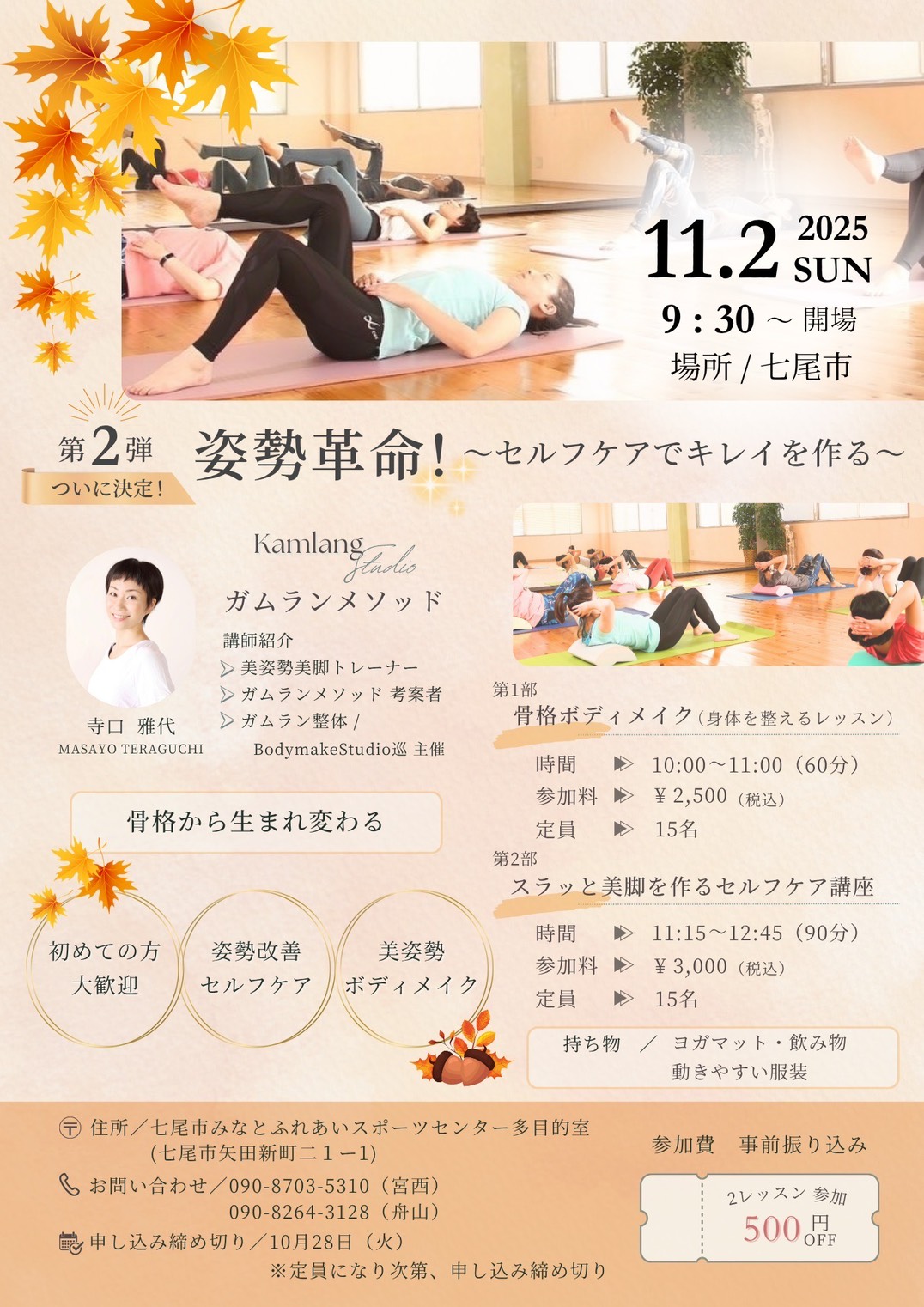 美姿勢美脚トレーナーでもあるStudio巡の寺口雅代先生が、身体の土台「骨格から」しっかり身体を整えるセルフメンテナンス法を教えてくださいます♪