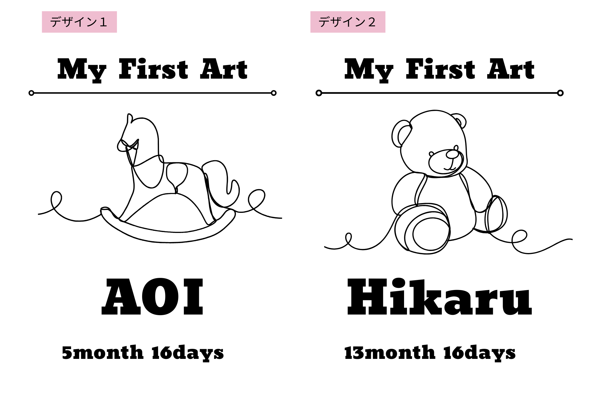 今回はクリアな台紙にお名前と月齢を入れたオリジナルバージョンをご用意しました!中央のデザインは、【木馬】と【くま】の2種類から選べます。