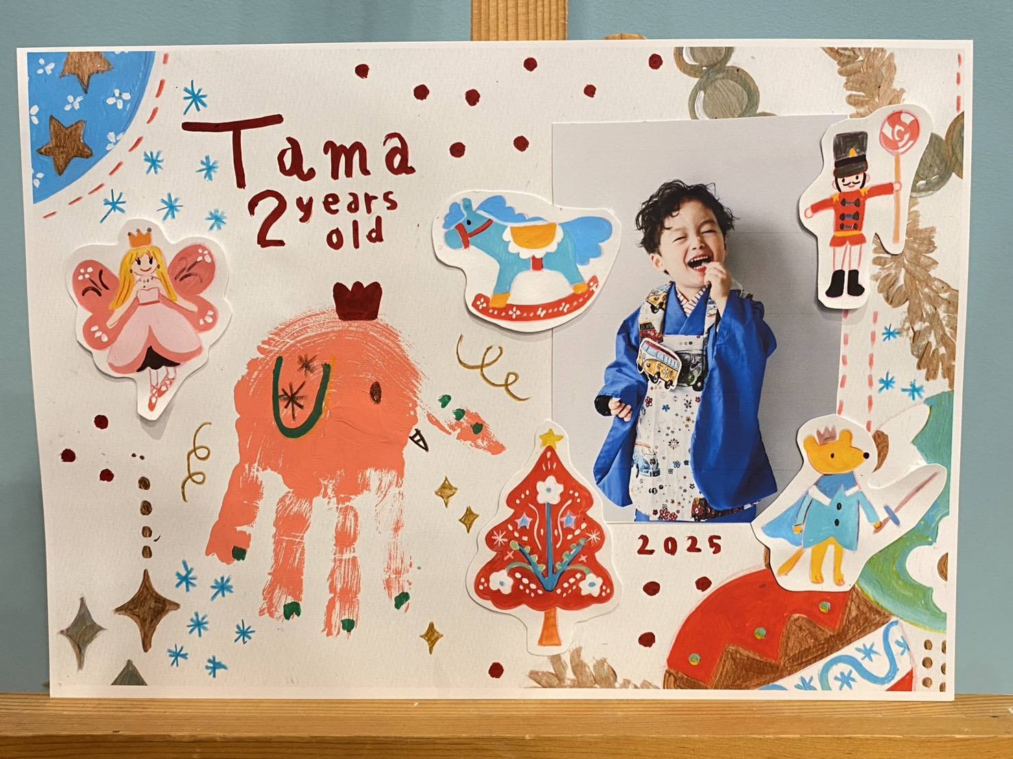 でこりんちゃんがデザインしたクリスマス限定の台紙に、お子さんの手形または足形をペタリ♡お子さんの手形や足形に合わせたデザインや似顔絵、月齢、お名前も描いてもらえるんです♪