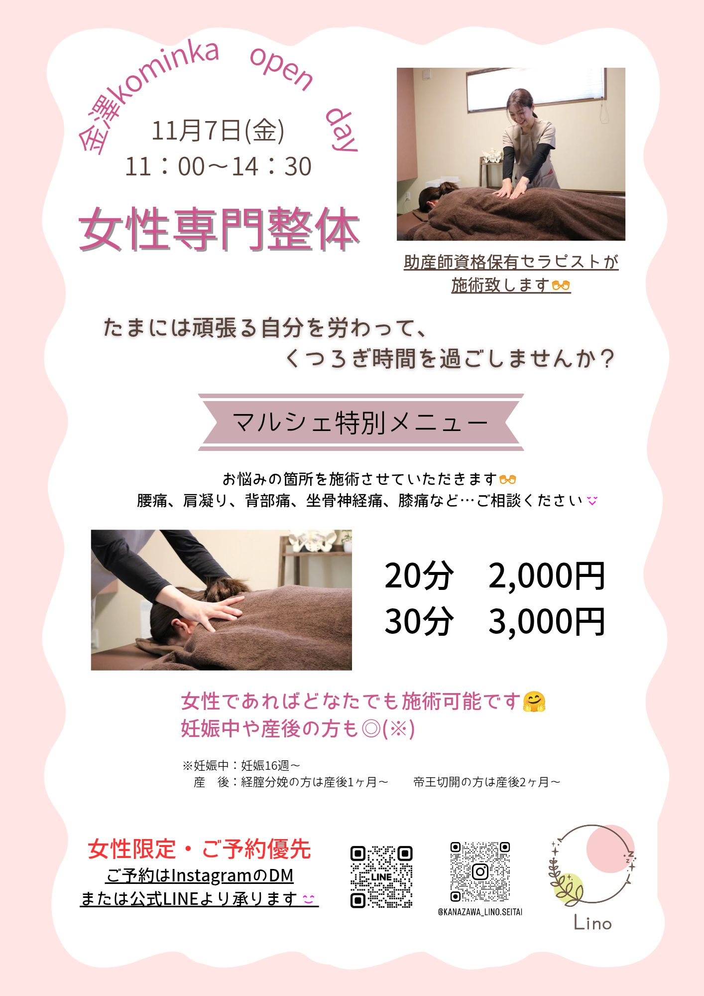 そんなマタニティ整体・産後整体 Linoから、金澤kominkaにて開催されるマルシェに出店されるとの情報が届きました!
