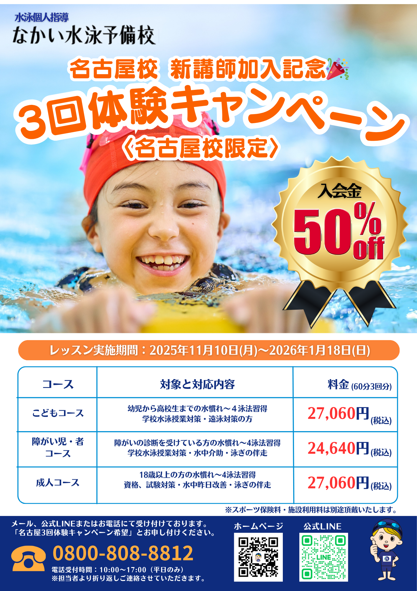 期間限定のお得なキャンペーンとなっていますので、水泳始めてみようかな?と思っていたママ・パパは、期間中に早めにお問い合わせください♡