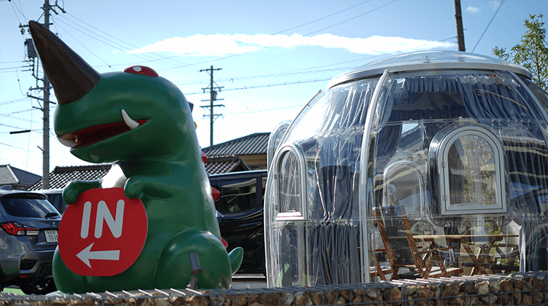 お店の目印は、清里中央オートキャンプ場のマスコットキャラクター「キヨッシー」です。尖った鼻や背中のデザインは八ヶ岳を、緑色のボディはキャンプ場のフィールドをイメージしているそうですよ。