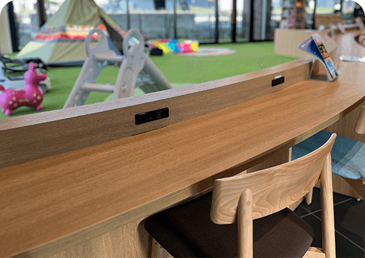 キッズスペースは、ガラス張りの窓に囲まれた、開放感あふれるエリアです。すべり台やおもちゃがあるので、子どもは何度も遊具にチャレンジしたり、おもちゃに集中したりできます。ママやパパにとっては、お子さんを見守りながら、ゆっくりと時間を過ごせる貴重な穴場スポットですよ。