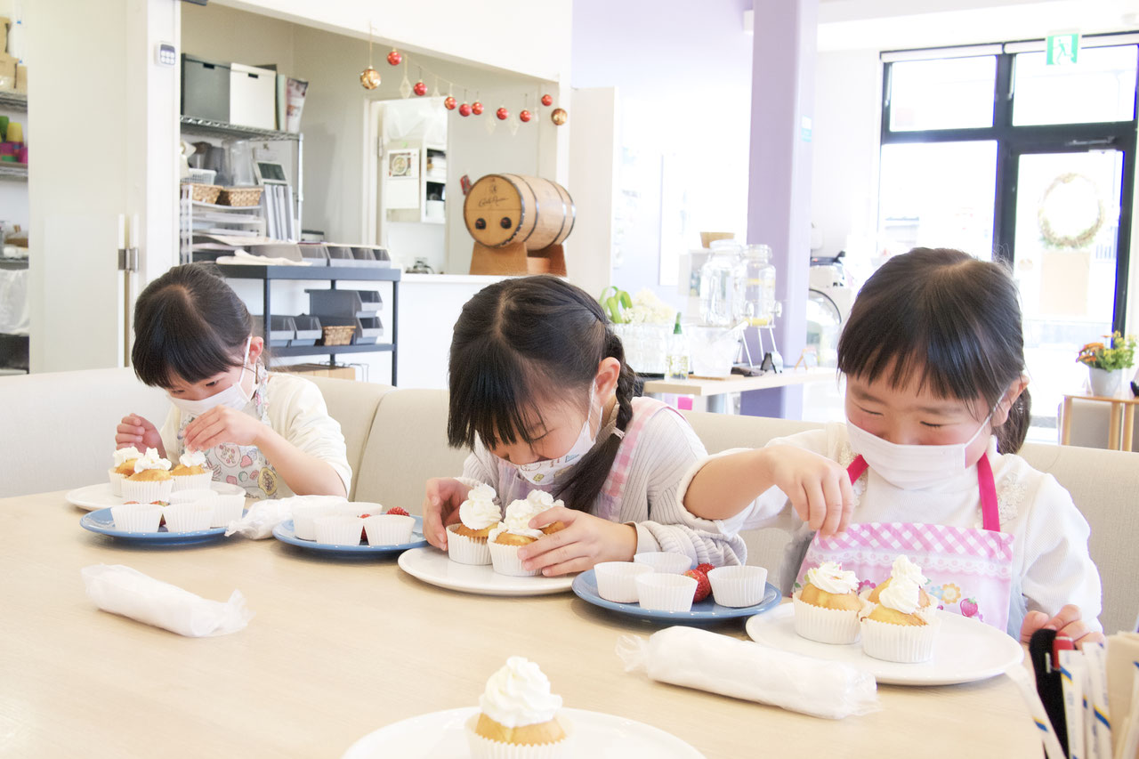 定休日以外の日曜日には、スイーツ教室を開催しています。教室は3歳から参加でき、1クラス3名までの少人数制。クッキングが初めてのお子さんも、IZUMI café 専属のプロのパティシエが丁寧にサポートしてくれるため、楽しく挑戦できますよ。