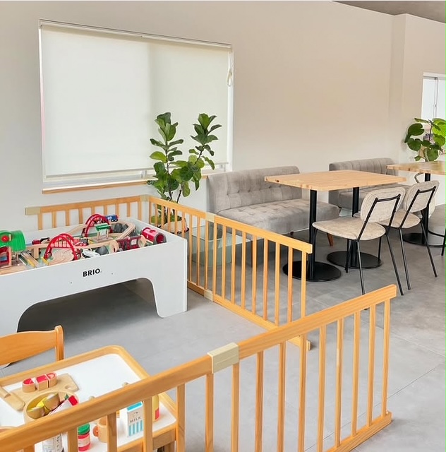 カフェの席は、テーブル席と小上がりがあります。テーブル席は、ベルト付きのハイチェアを完備しています☆お洒落な空間ながら、フードコートのように広々としています!テーブル席や小上がりのすぐ近くには、おもちゃや絵本があるキッズスペースがあります。食事の前後に遊ぶことができますよ♪ボルタリングの壁なども設置されていて、お子さんが楽しく過ごせる場所です。