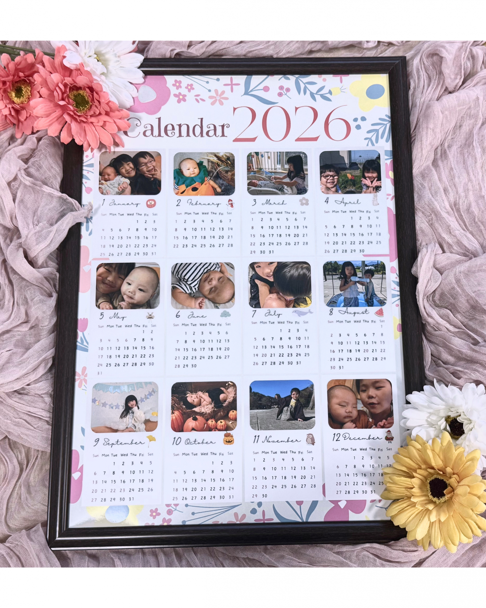 お子さまの写真やお気に入りの画像を12枚お預かりし、世界にひとつの特製カレンダーにしてお渡しします☆