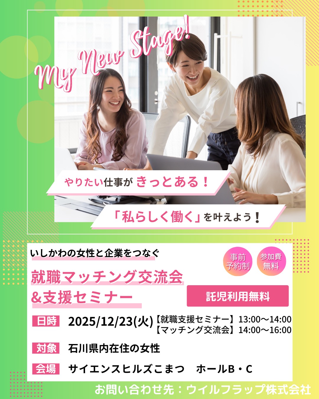 | イベント名 | いしかわの女性と企業をつなぐ〜就職マッチング交流会&支援セミナー〜 |