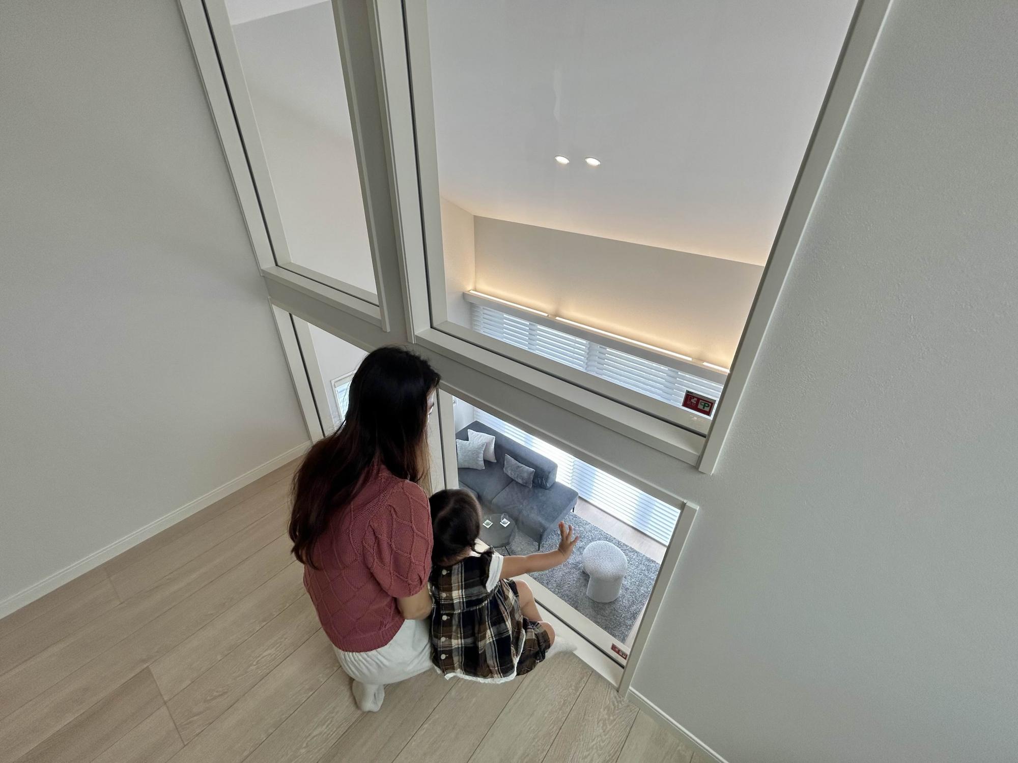 拭き抜け仕様のリビングで、どこからでも家族の気配を感じられる工夫がされています◎