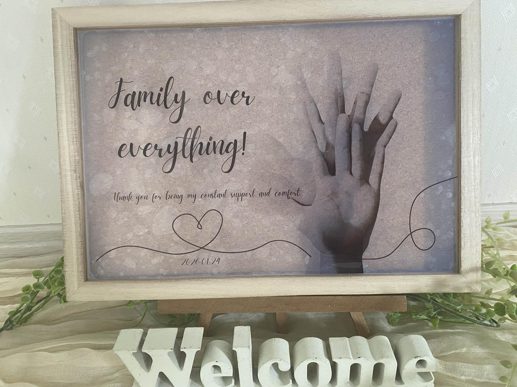 家族の手形を撮影し、透明シールに印刷した後に、ウッドボックスに貼り付けます。