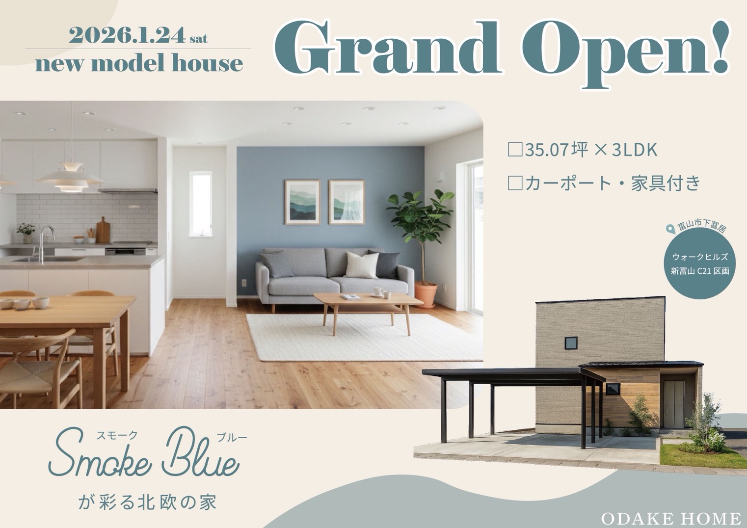 オダケホームさんから、年明け1/24(土)に、新しいモデルハウス完成&見学会のお知らせが届きましたよ♪