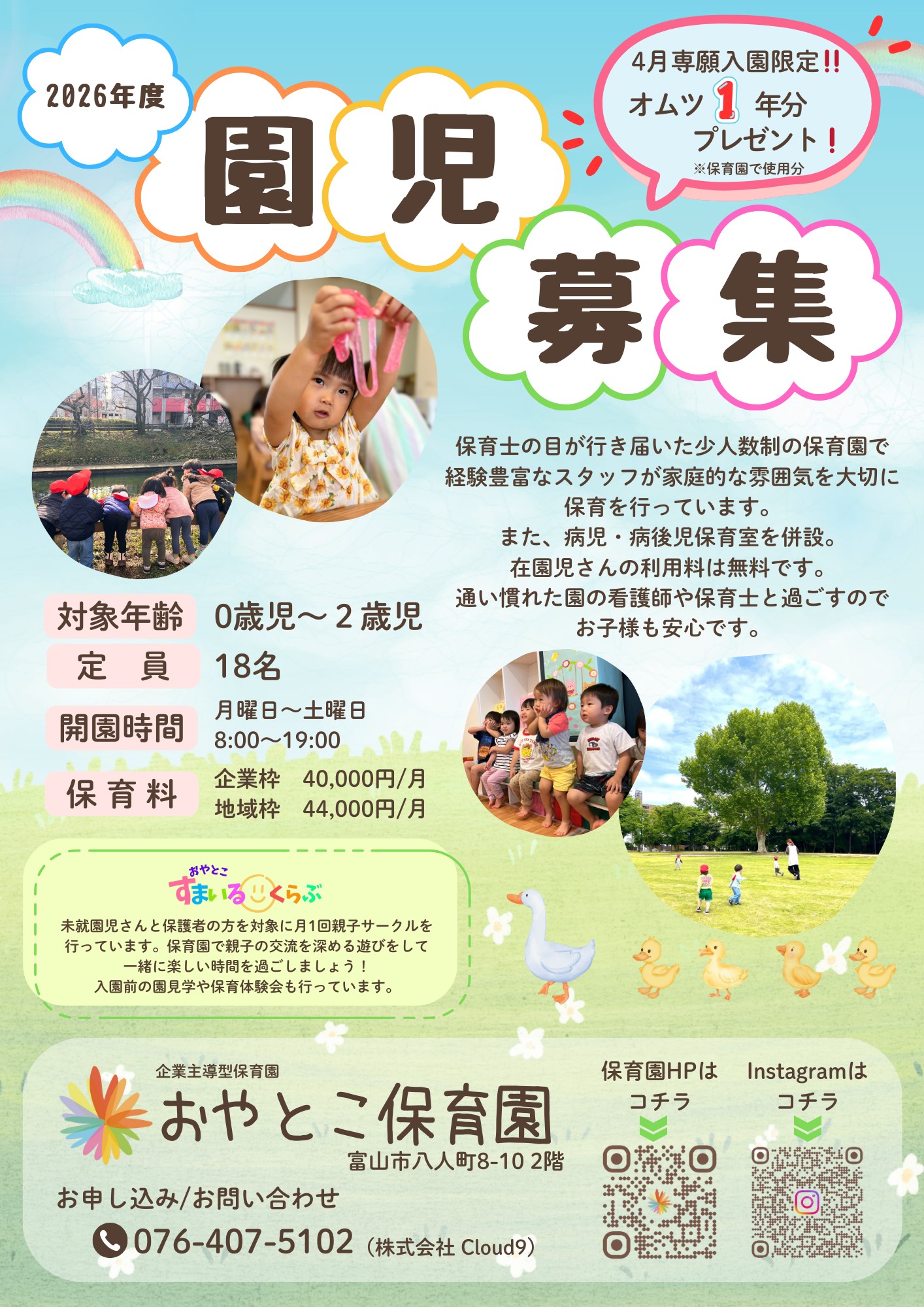 富山市のマチナカにある「おやとこ保育園」にて、親子サークル『おやとこすまいるくらぶ』を月イチで開催しています★