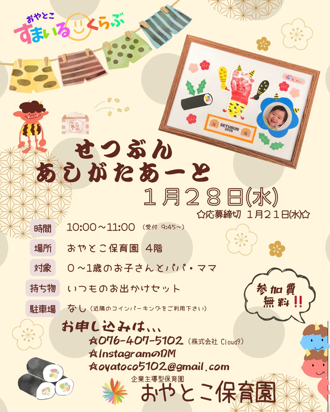 | イベント名 | おやとこすまいるくらぶ「足形アートで節分パネル作り」 |