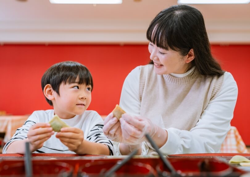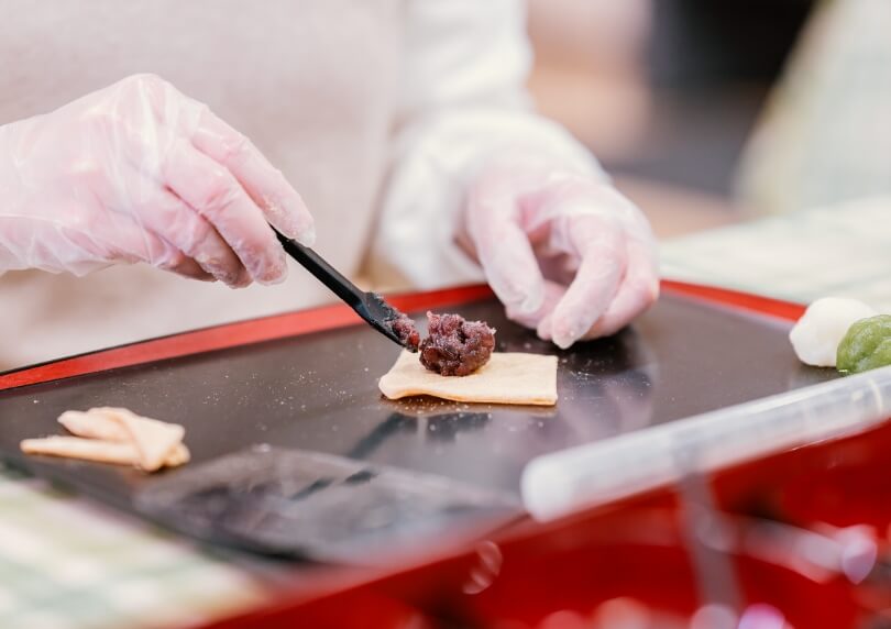 「おてがるおたべ体験」は、小さなお子さんから参加できます。生地にあんこを挟む、シンプルな工程を体験する内容となっています。