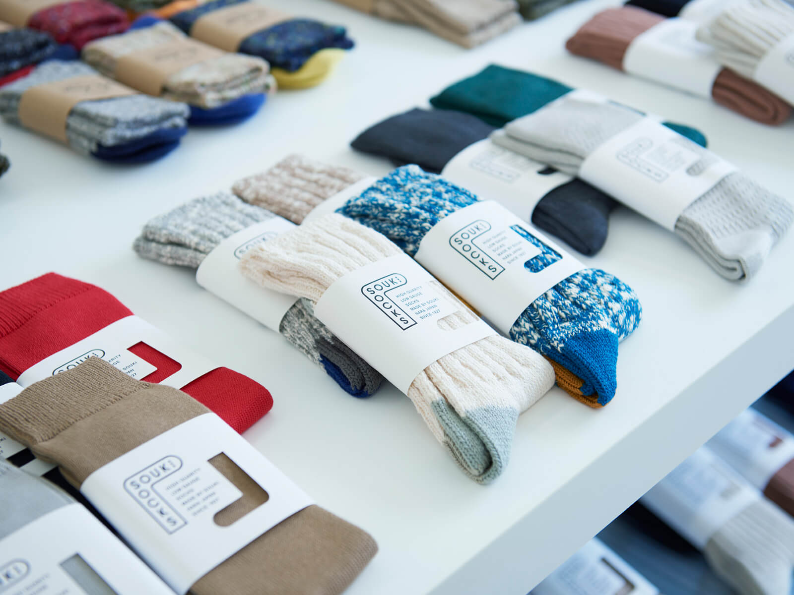 くつ下のような身近なアイテムは、オンラインで購入する機会も多いですよね。S.Laboにはショップが併設されており、SOUKIが手がけるくつ下を実際に手に取り、手触りや質感を確かめながら選べます。
