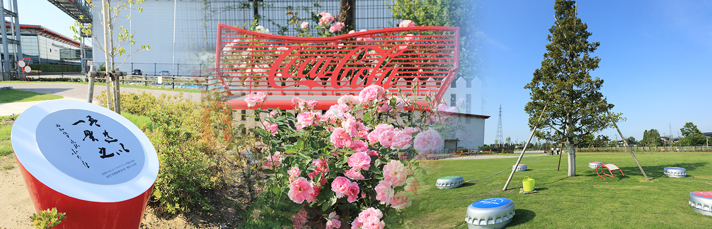 公園の一角はバラ園のようになっており、ベンチもあるので、お散歩や休憩にぴったりです。コカ・コーラを築いた人達や、歴代社長の思いが書かれたモニュメントが点在しています。世界に一つだけの、コカ・コーラの瓶の形をした「ししおどし」もありますよ!