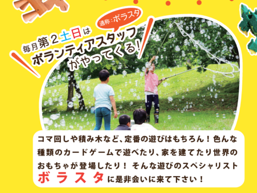 毎月第2土日は、遊びのスペシャリストがボランティアとして登場するイベントが開催され、コマや積み木などの定番おもちゃから、カードゲームや世界のおもちゃも登場しますよ♪