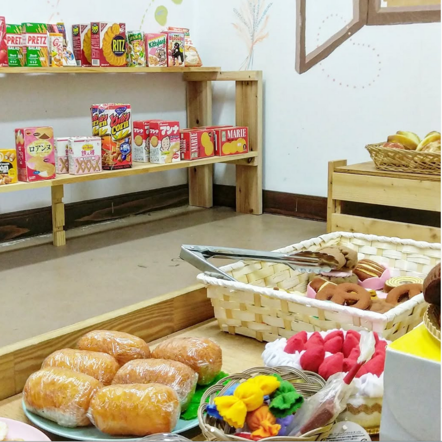 お店屋さんごっこのログハウスの壁の絵も手書きで描かれ、おでんなどの小物は、フェルトや布を使用して手縫いで作られています。手作りのおもちゃの温かみを感じながら、買い物ごっこや店員さんごっこが楽しめますよ♪