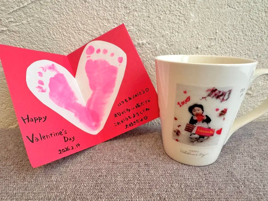 製作は、オリジナル写真シールでマグカップ&足形アートでメッセージカードを作ります♡