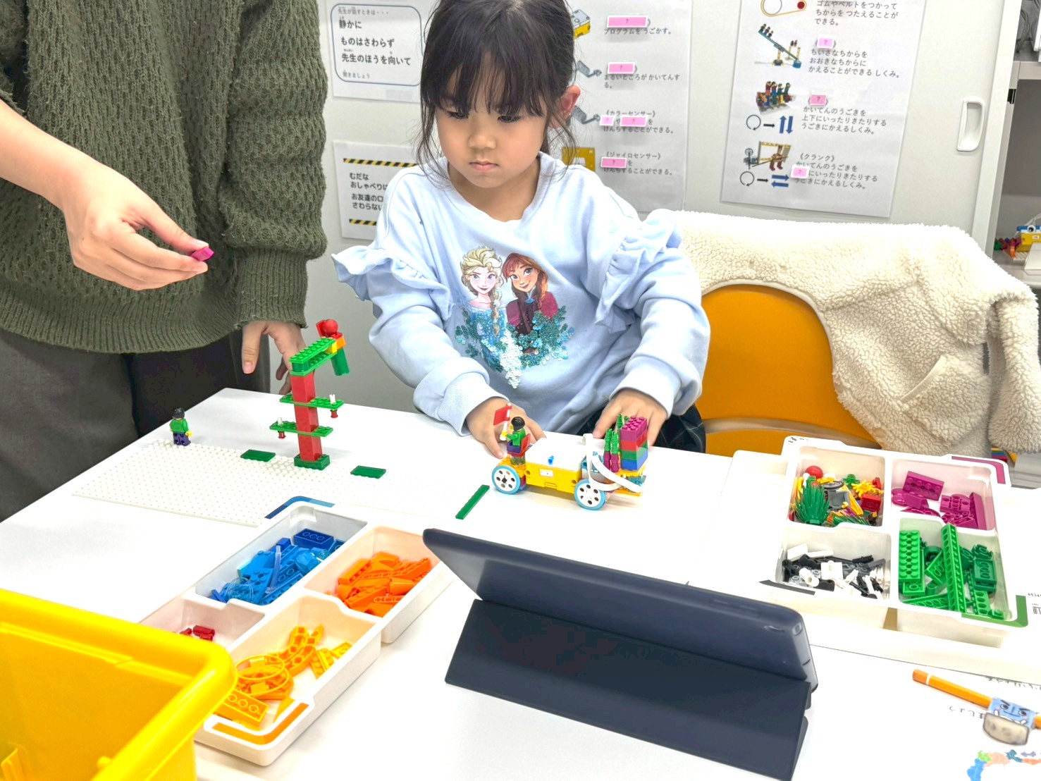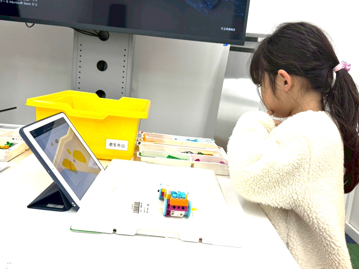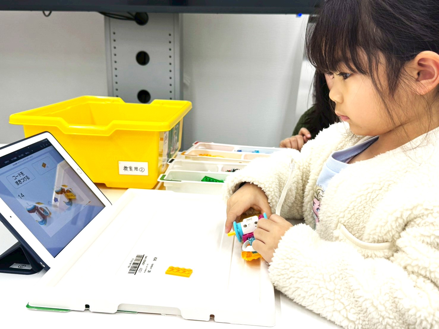 収穫ロボットは、タブレットの指示に沿って、順番に作成していきます。「次はどれかな?」と、画面を見ながら必要なパーツを探し、少しずつ組み立てていきます。