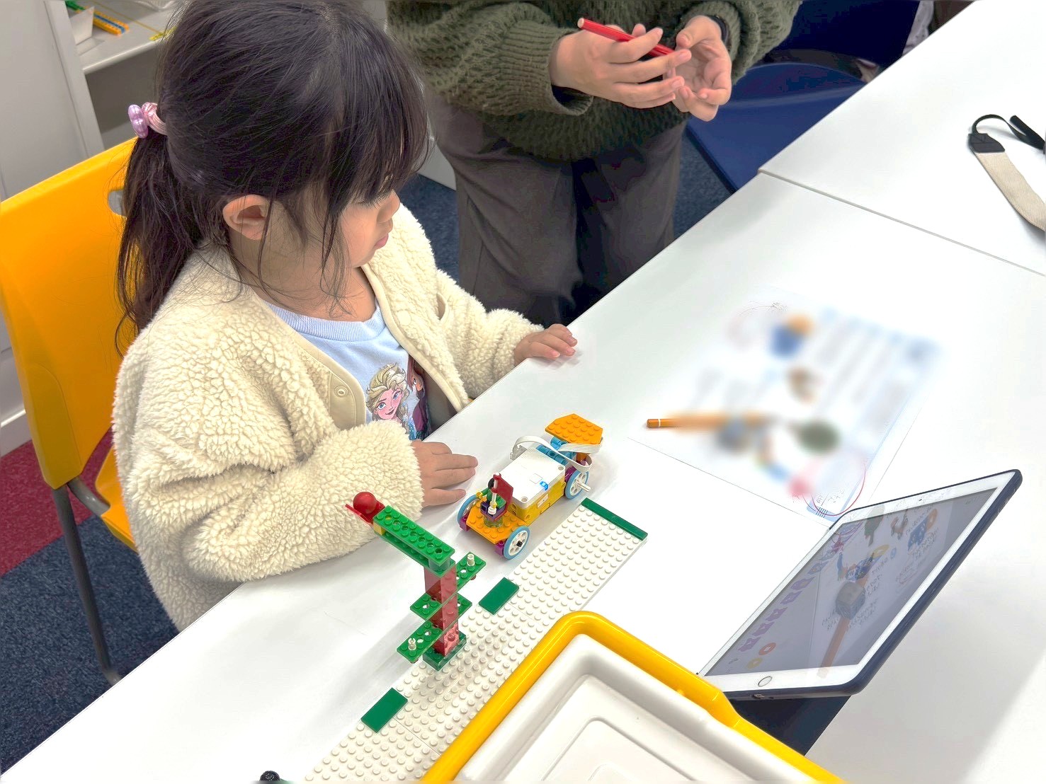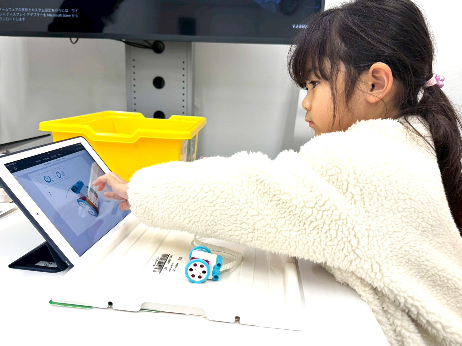 体験してくれたのは、年長のHちゃん。プログラミングは初めてでしたが、先生のお話を聞きながら、少しずつチャレンジしてくれました♪