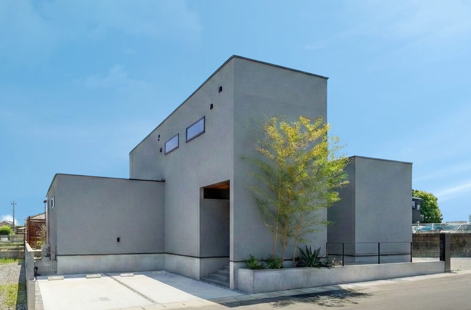 外観は、落ち着いたグレーの外壁に木目のアクセントが映える、上質でモダンなデザイン。水平ラインを意識したフォルムが重厚感を演出しつつ、タイルテラスへとつながる開放的な設計で、外と内が心地よくつながる住まいです。