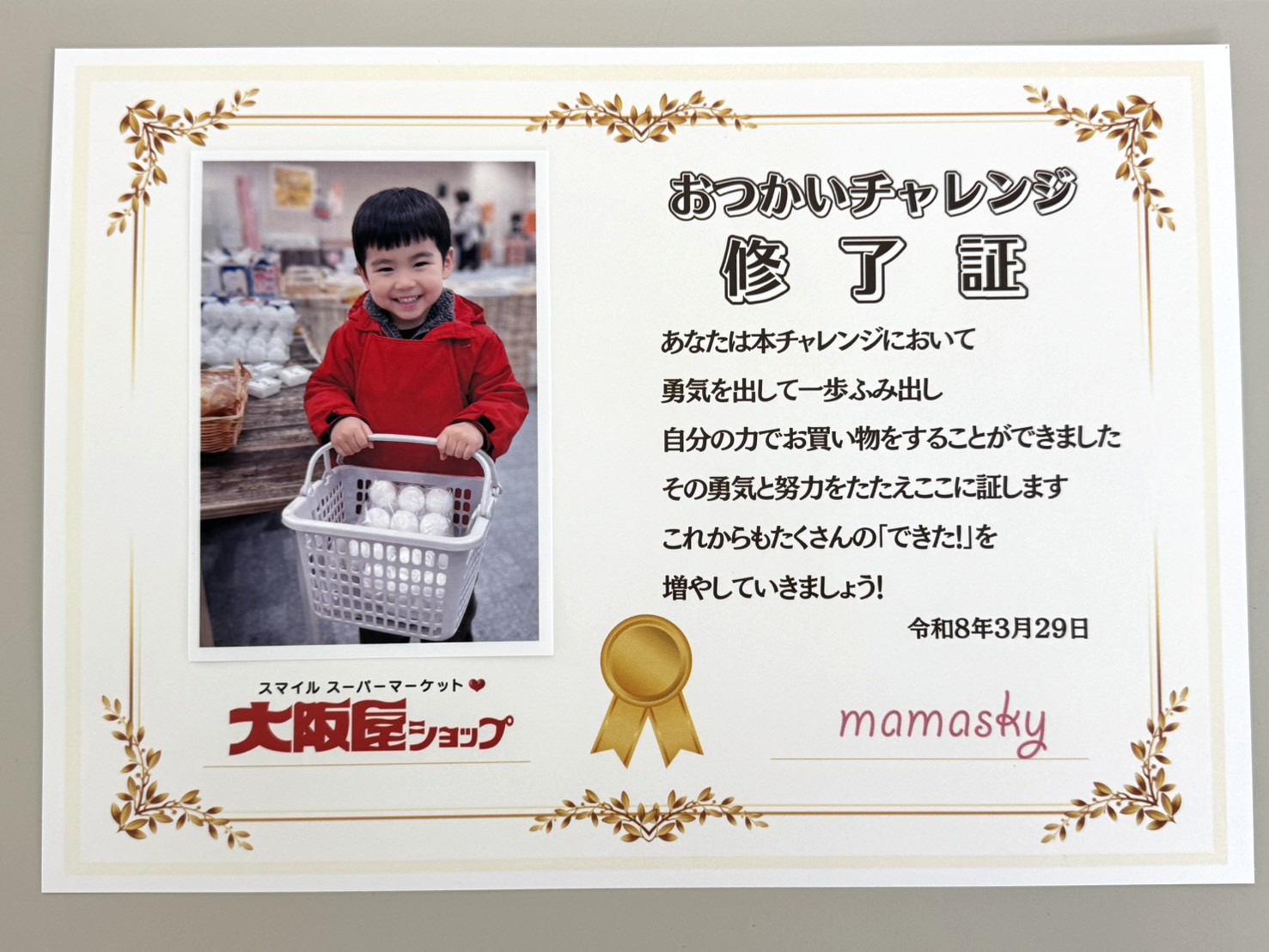 お買い物が終わったら、賞状をもらって「おつかいチャレンジ」は完了!
