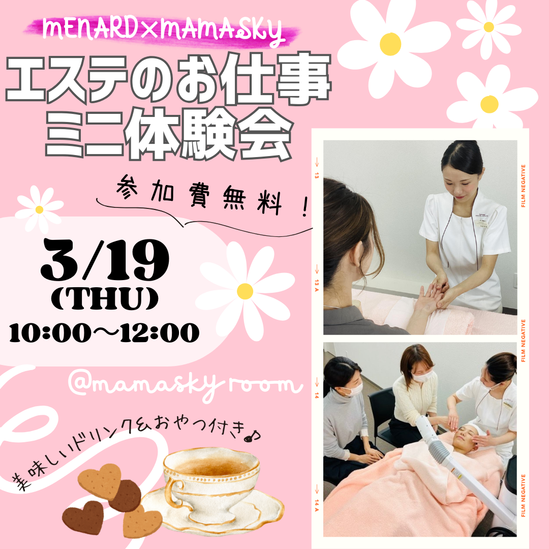 | イベント名 | 美容好きママのためのエステのお仕事ミニ体験会|メナード×mamasky コラボイベント |