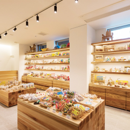 入り口から続くトンネルをくぐれば、選び抜かれたおもちゃショップが登場!数は700点以上あり、西日本ではここにしかない、国内のおもちゃ作家のおもちゃが購入できます。おもちゃに詳しい専門スタッフがいるので、遊び方や年齢に合わせたチョイスの仕方など、相談してみてくださいね。