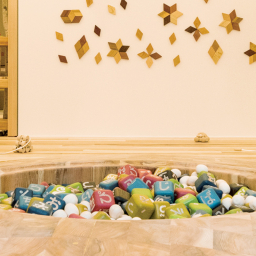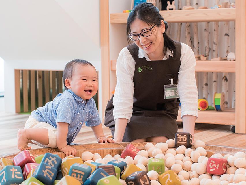 1階は0~2歳児の赤ちゃんのための木育ひろばです。ハイハイで登れる山や、卵型のおもちゃがたくさん入った「たまごプール」など、木の香りを楽しみながら遊ぶことができます♪