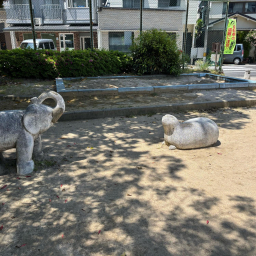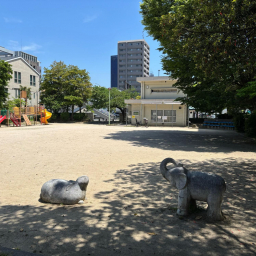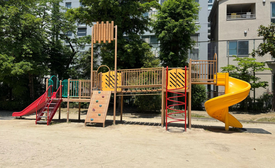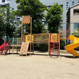 気分が明るくなるような鮮やかな黄色のすべり台を中心に、様々な形の登り遊具が組み合わさった大型複合遊具が設置されています。小さなお子さんでも安心して登れる低めの階段もあるので、よちよち歩きでも楽しめますよ。ブランコや背丈にあった大きさの選べる鉄棒も並び、バリエーション豊富に遊べます!砂場も広々としていて◎周囲には木陰やベンチも多く、親御さんものびのび遊ぶお子さまを安心して見守ることができます♡