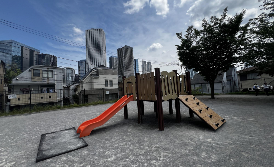 遊具は一つで、公園のサイズもコンパクトでシンプルな作りです。広場の中央には、小さなお子さんからチャレンジできるすべり台があり、高さも低いため、一人で遊びたい盛りの子どもにもぴったりです。ママやパパは、ベンチで座って遊びに集中するお子さんを見守れるので、一息つくことができますよ。