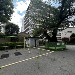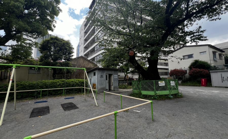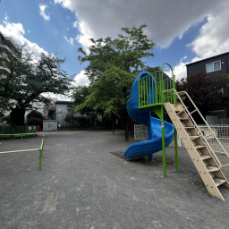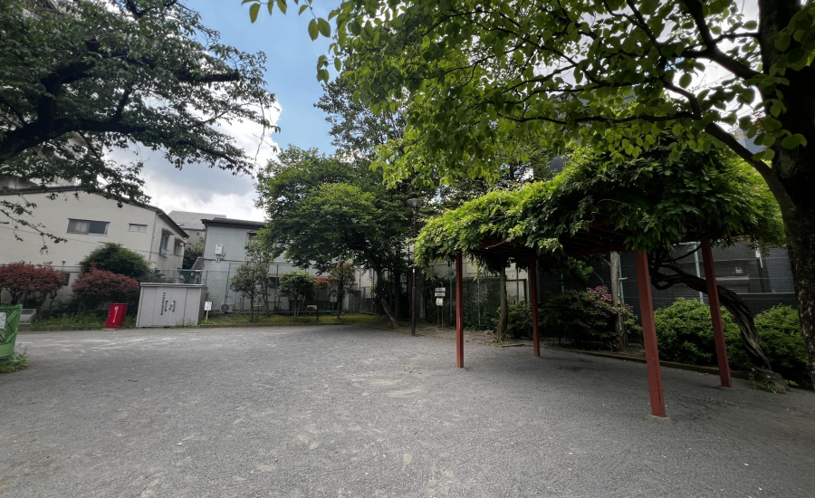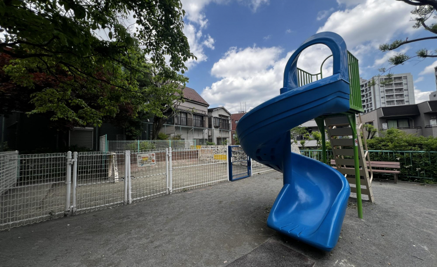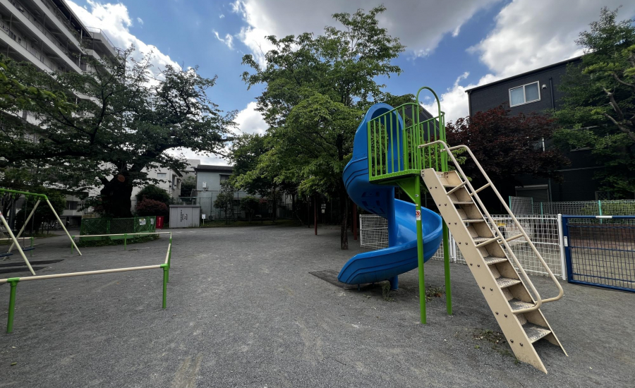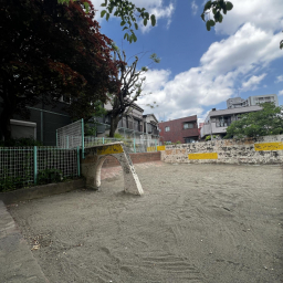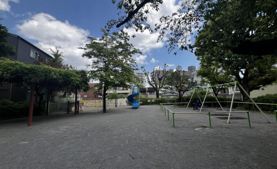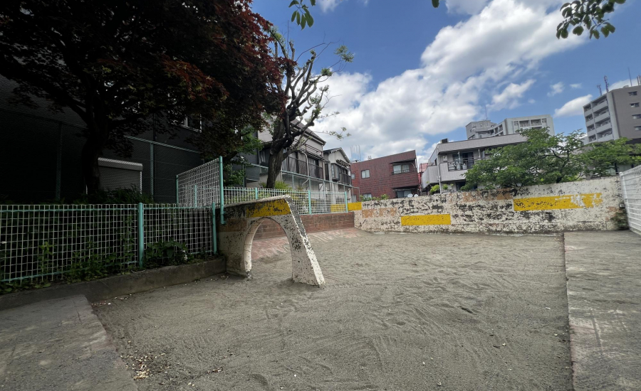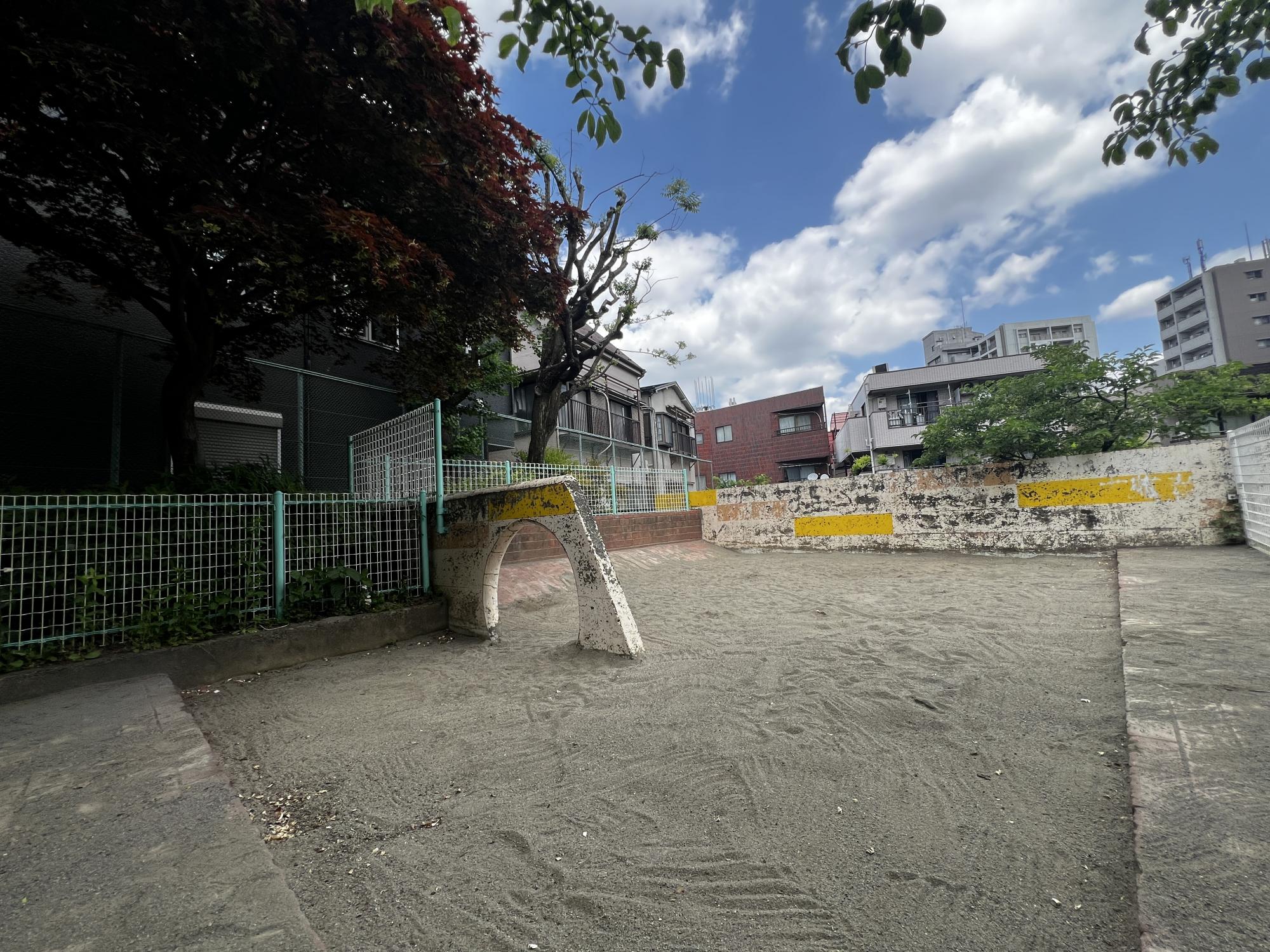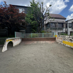最寄り駅から徒歩3分とアクセスが良く、広々とした砂場があるのもポイントです。砂場には穴が開いている壁が設けられており、子どもが身をかがめてくぐったり、ハイハイしながら通り抜けたりと、体を使った遊びが楽しめます。レンガづくりの坂もあり、砂をかけて流したり、砂場の縁を使っておままごとをしたりと、遊び方の幅が広がるのも特徴です。周辺ではなかなか見られないつくりの砂場なので、ここならではの遊びができます♡