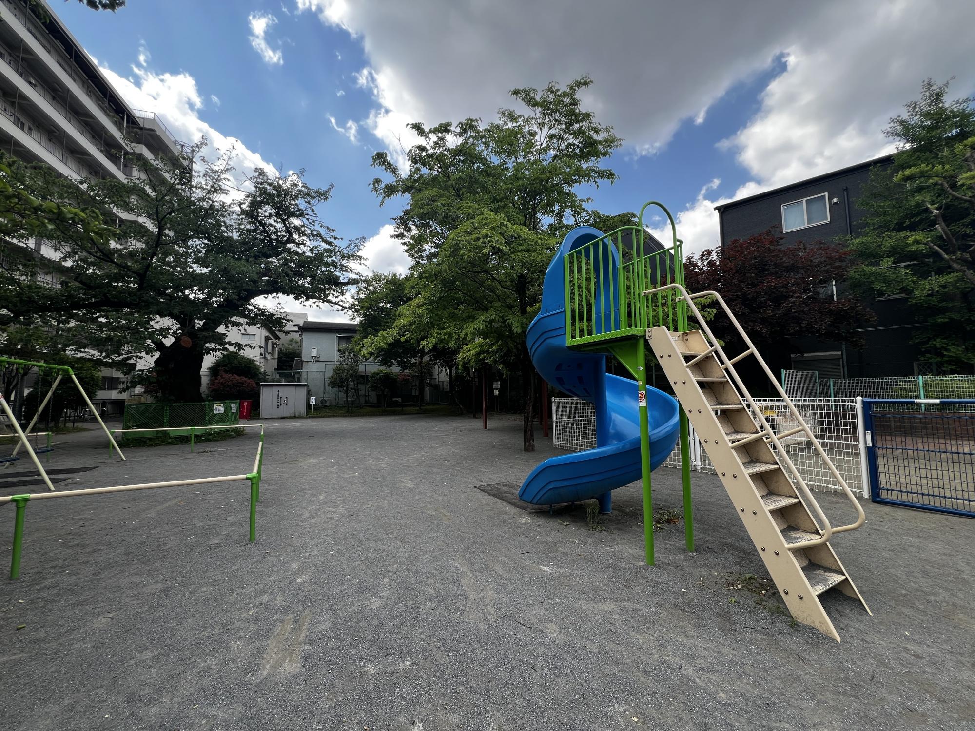 遊具は、ブランコや柵付きの砂場、らせん状のすべり台などがそろっています。緑豊かなパーゴラや水道、トイレも完備されているため、強い日差しを避けて休憩できるのが便利です♪